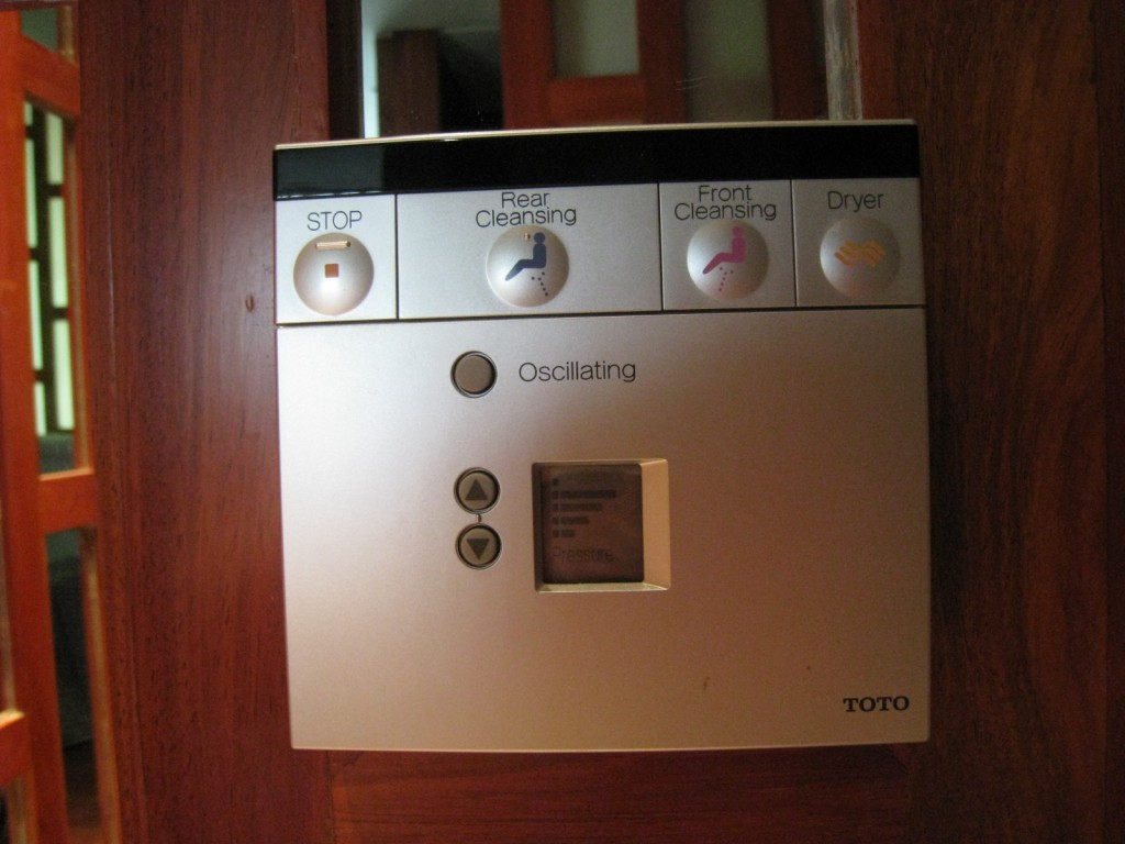 The Fogey household’s first full-on Toto bonanza was at the Park Hyatt in Tokyo. The room was equipped with a Washlet that had not only a heated seat but also a rinsing spray-probe for front and back bottoms and a warm air cleft dryer. The water spray could be constant or oscillating; fierce or gentle. The cosy warm caress of the seat was wonderful and at least one attendant Fogey spent many happy hours thus ensconced. The undercarriage hose was another matter.